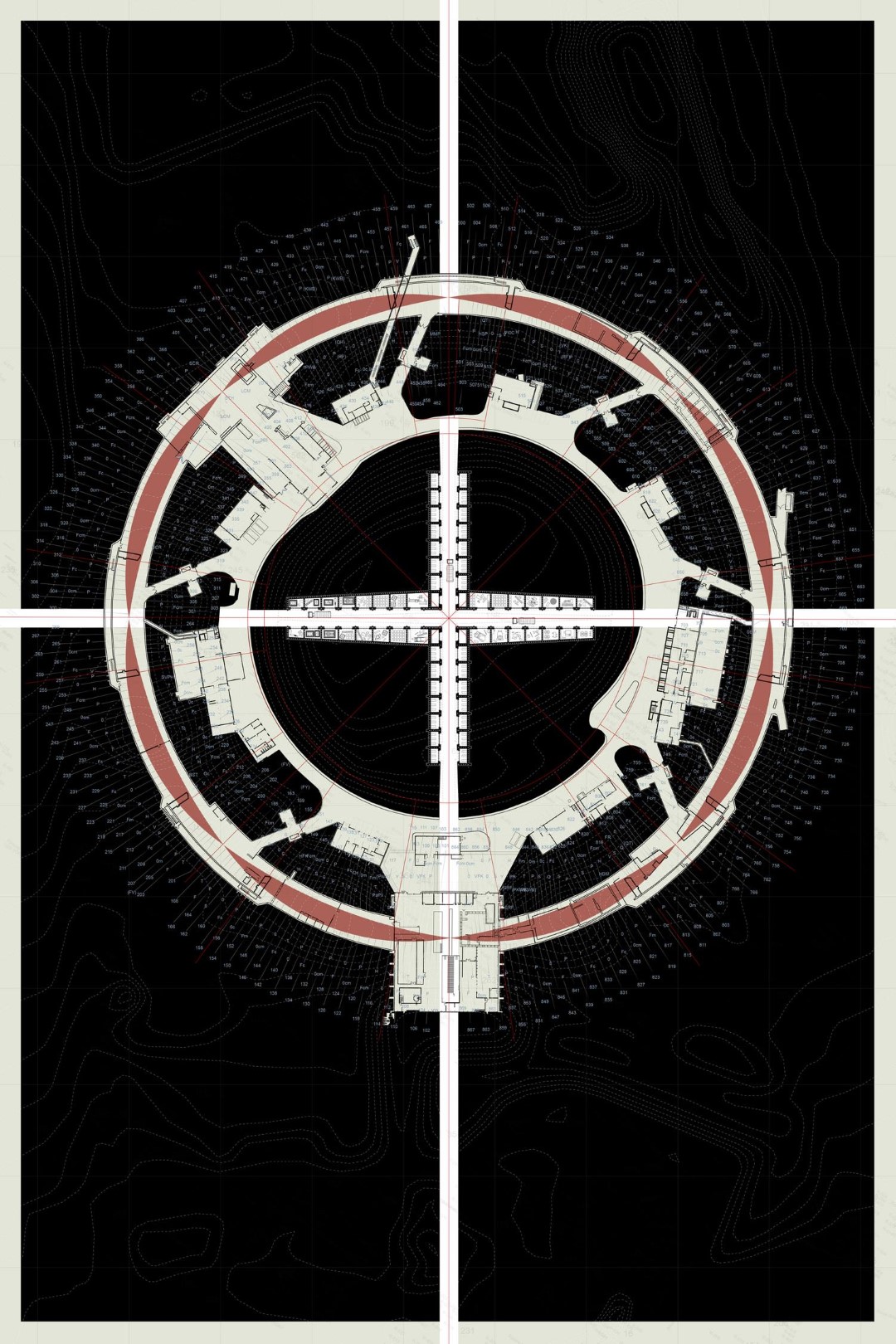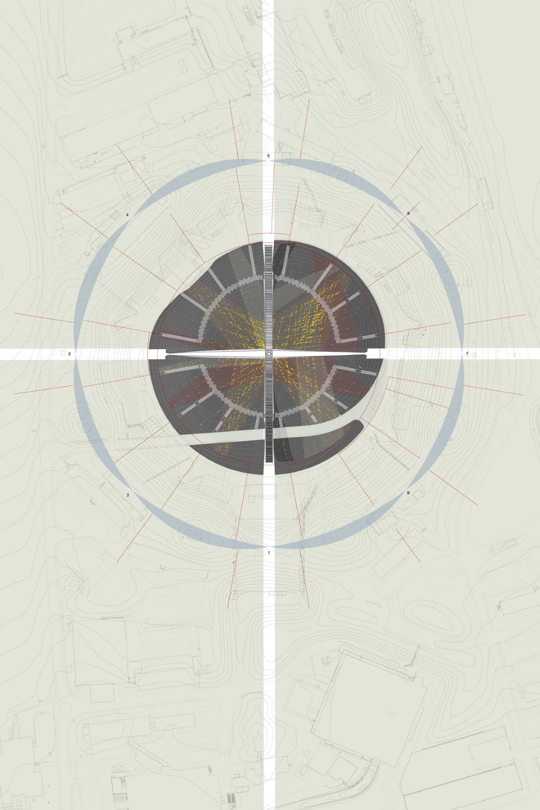 Between 1-549 takes cue from the precise construction and scientific logic of the now decommissioned Intersecting Storage Ring (ISR) accelerator: an array of forgotten magnets, a constellation of indecipherable codes. The project cuts into the abandoned mound at the center of the site to forge two intersecting paths of storage and display whose opposing tectonics give rise to the new home for CERN’s fascinating Heritage Collection. In exploring the affinities between accumulation, collection and exhibition, the project transforms the numerical, abstract genesis of the site into a series of material itineraries and experiential passages. The title Between 1-549, referring to the numbering system of the buildings at CERN’s Meyrin campus, is meant to illustrate this tension of the building’s purpose; it does not fit into CERN’s numbering system, but rather takes on a large number of functions to exist between these different states.
