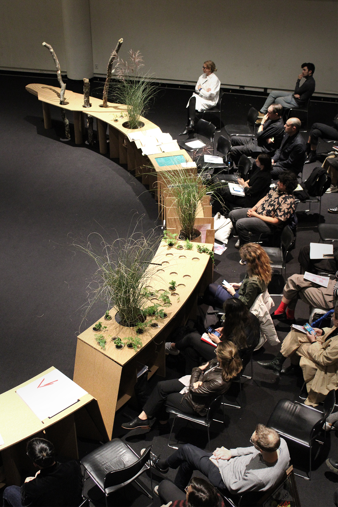 Designed in collaboration with Rosalea Monacella, this segment aimed to explore how studio environments foster interaction not just interpersonally, but with tools, techniques, and theories. Constructed out of cardboard sheets, the interaction section aimed to entangle plants, archival material, and critical pedagogical texts with tools like light tables, material samples, models, and cutting mats. Together, the objects suggest an approach to pedagogy that encourages the intermixing of techniques and theory as an integral part of design learning.